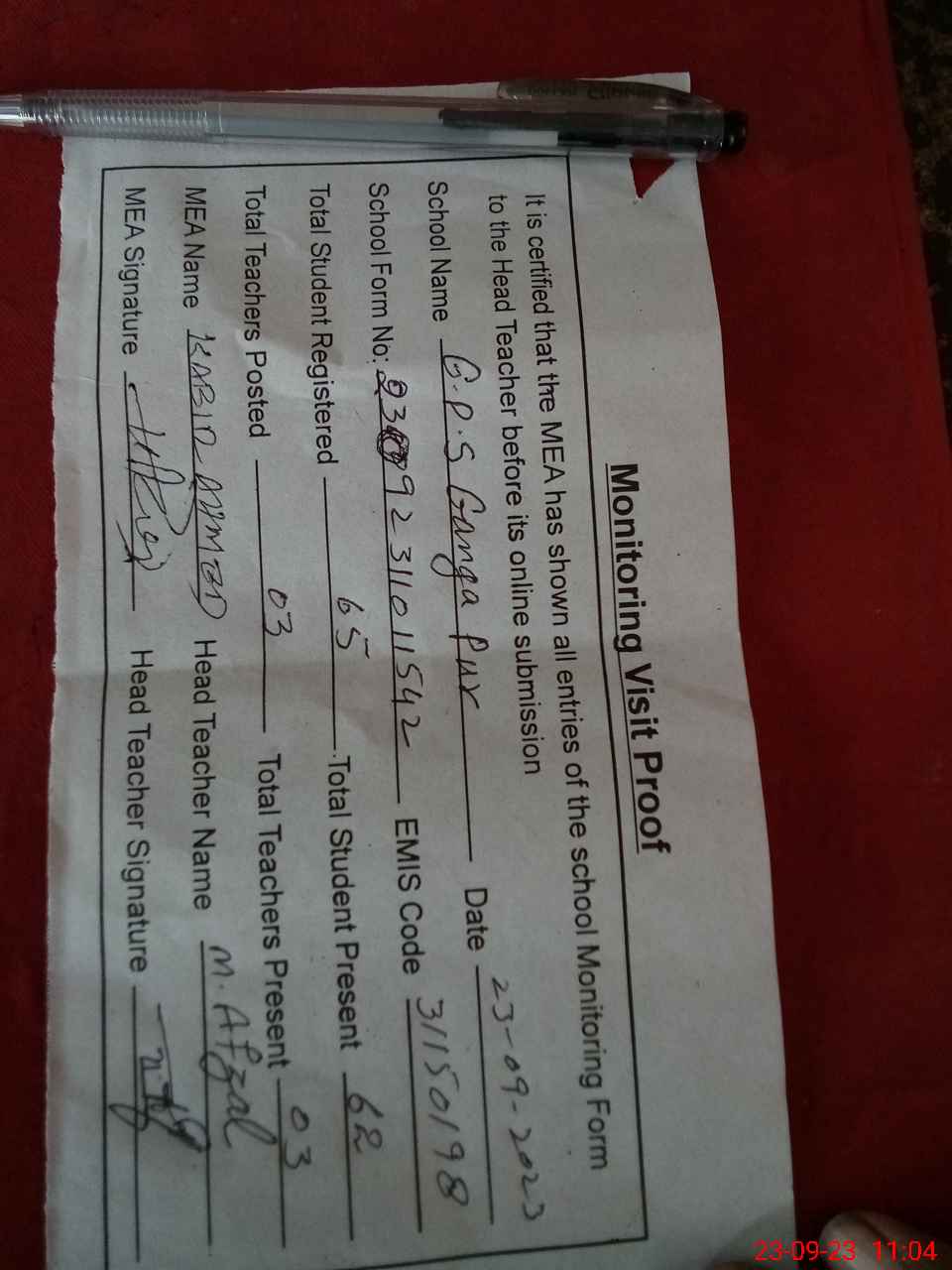 | Attendance Register | Head Teacher | MEA with School | Visit Proof |