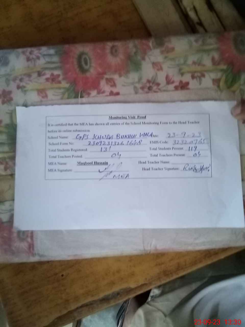 | EMIS Code: 32320765 | Name of School: GPS KHUDA BAKHSH WALA | |||