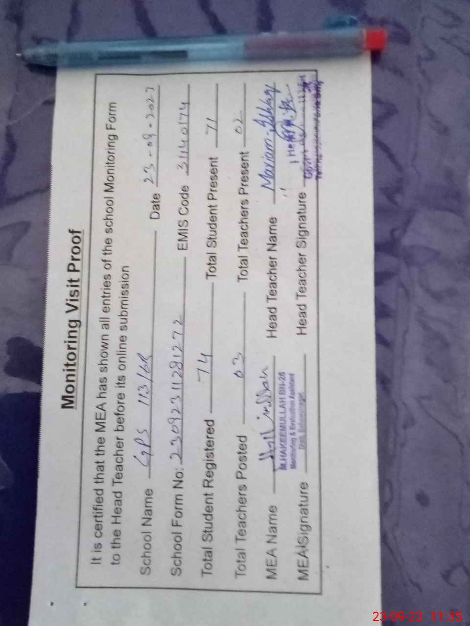 | Attendance Register | Head Teacher | MEA with School | Visit Proof |