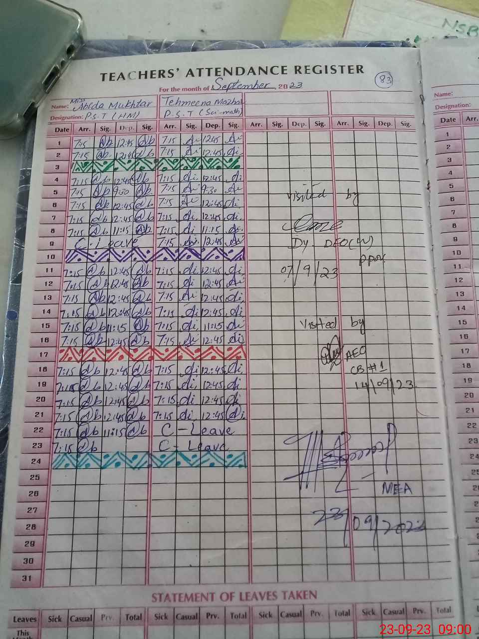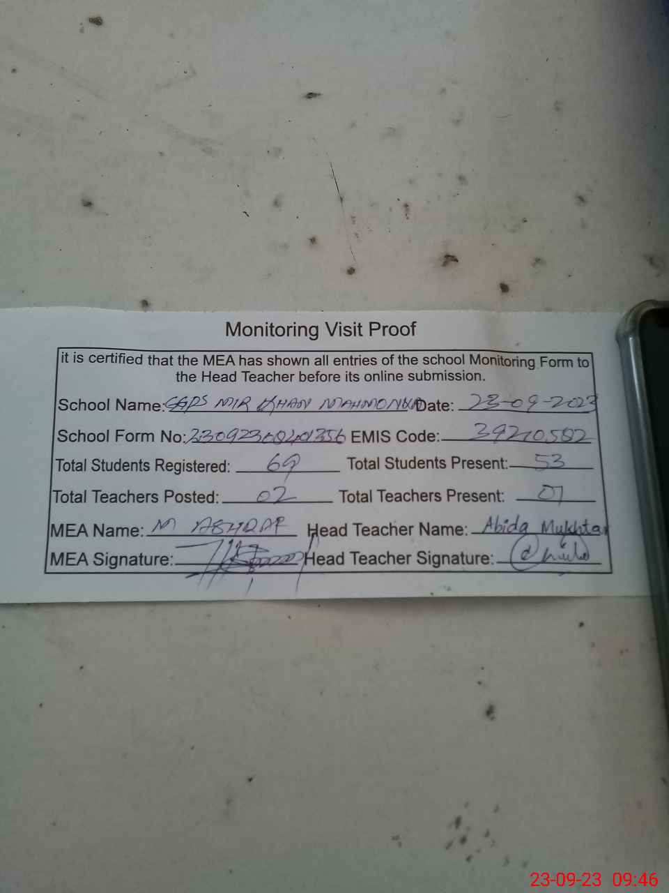 | Attendance Register | Head Teacher | MEA with School | Visit Proof |