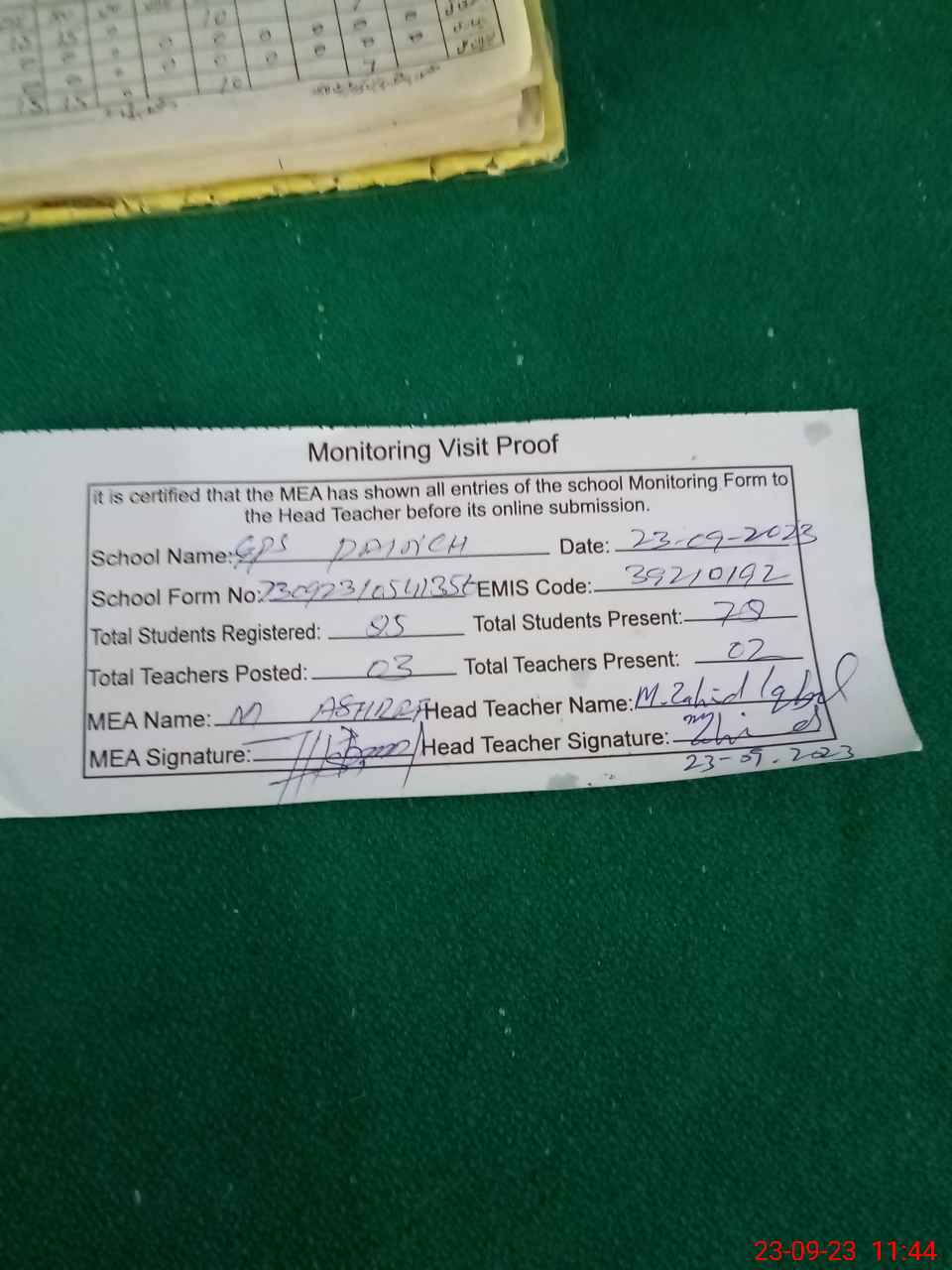 | Attendance Register | Head Teacher | MEA with School | Visit Proof |