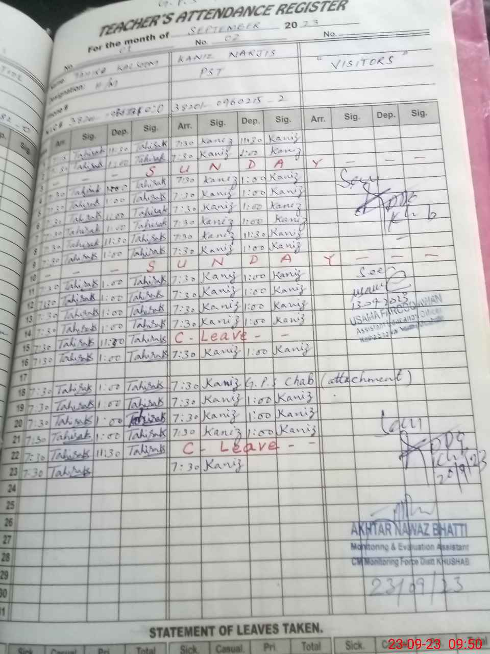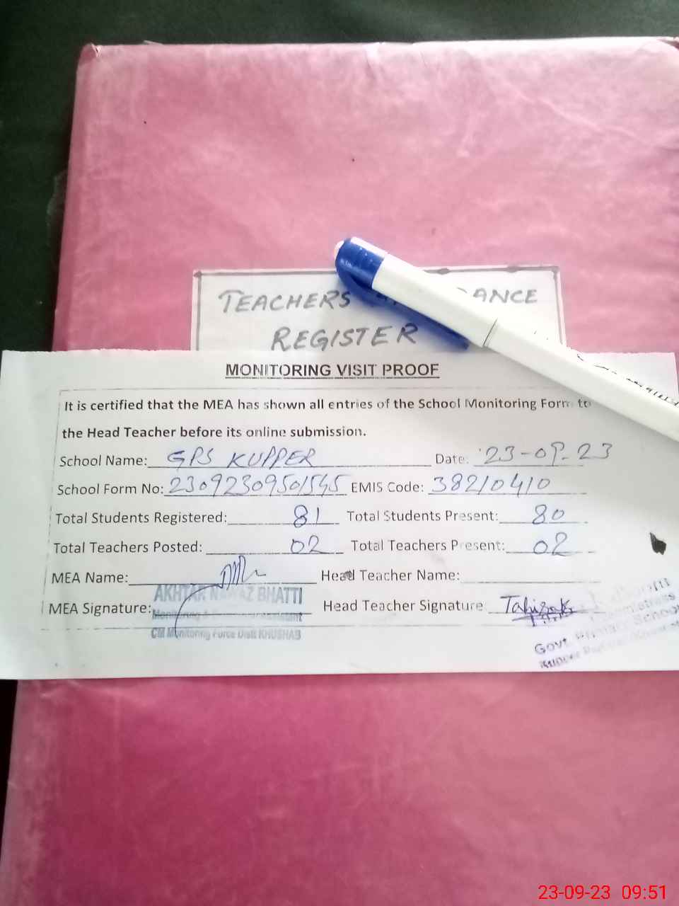 | Attendance Register | Head Teacher | MEA with School | Visit Proof |