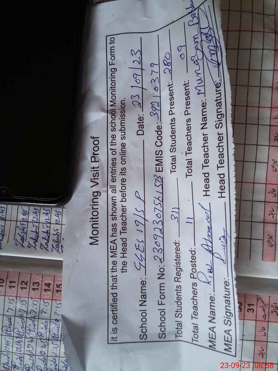 | Attendance Register | Head Teacher | MEA with School | Visit Proof |