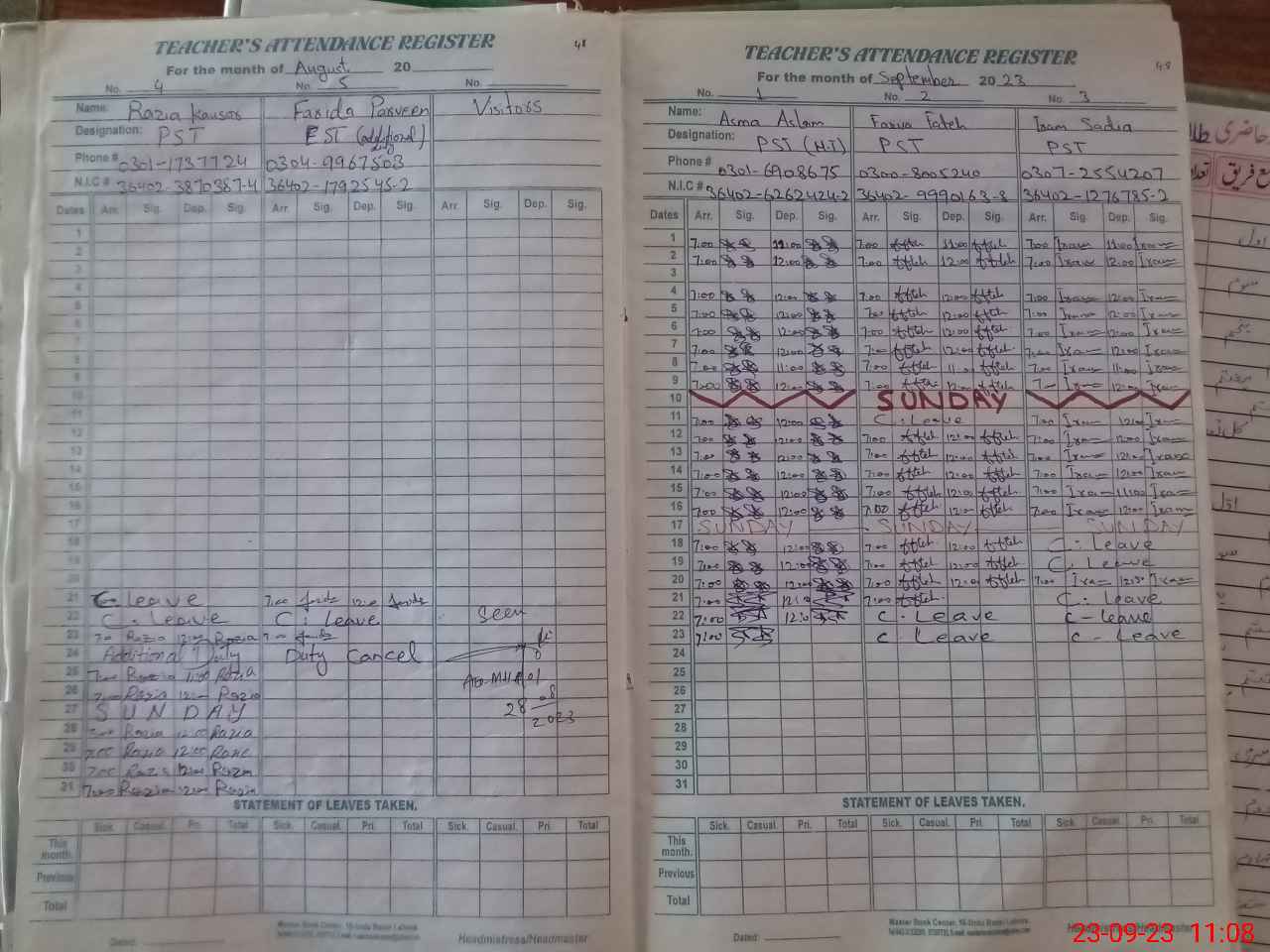 | CNIC | Full Name | Designation | R/C | Absence During Last Calender Month |