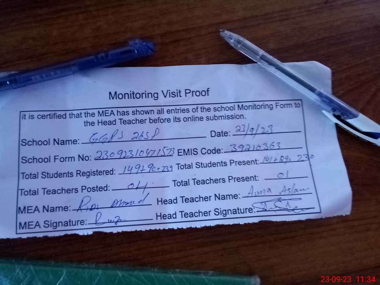 | Attendance Register | Head Teacher | MEA with School | Visit Proof |