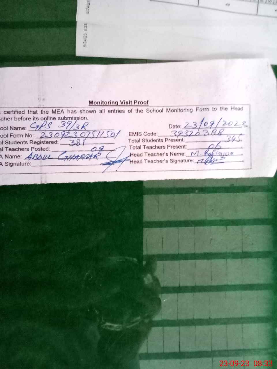 | Attendance Register | Head Teacher | MEA with School | Visit Proof |