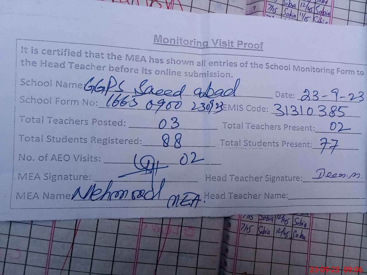 | Attendance Register | Head Teacher | MEA with School | Visit Proof |