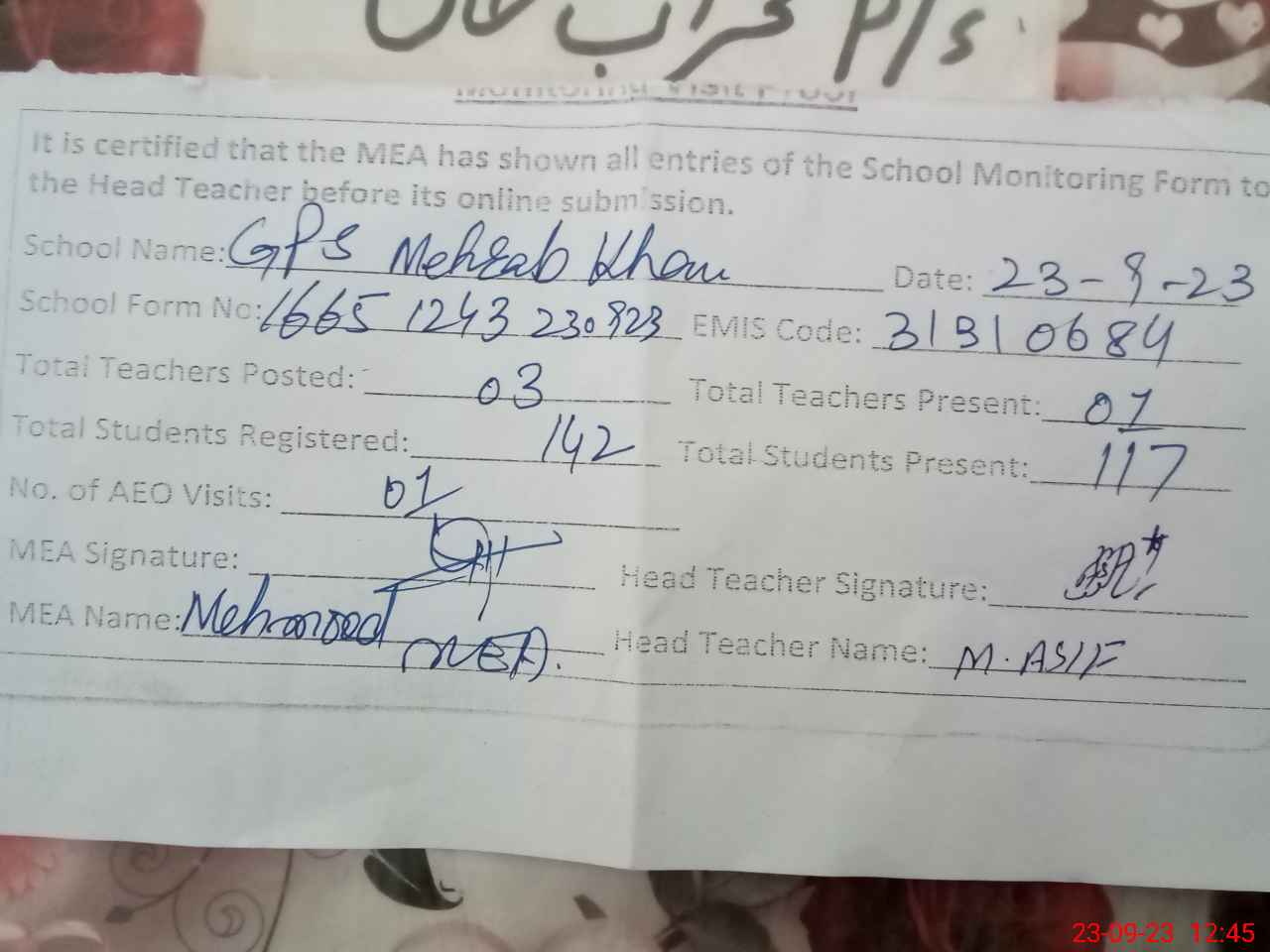 | EMIS Code: 31310684 | Name of School: GPS MEHRAB KHAN | |||