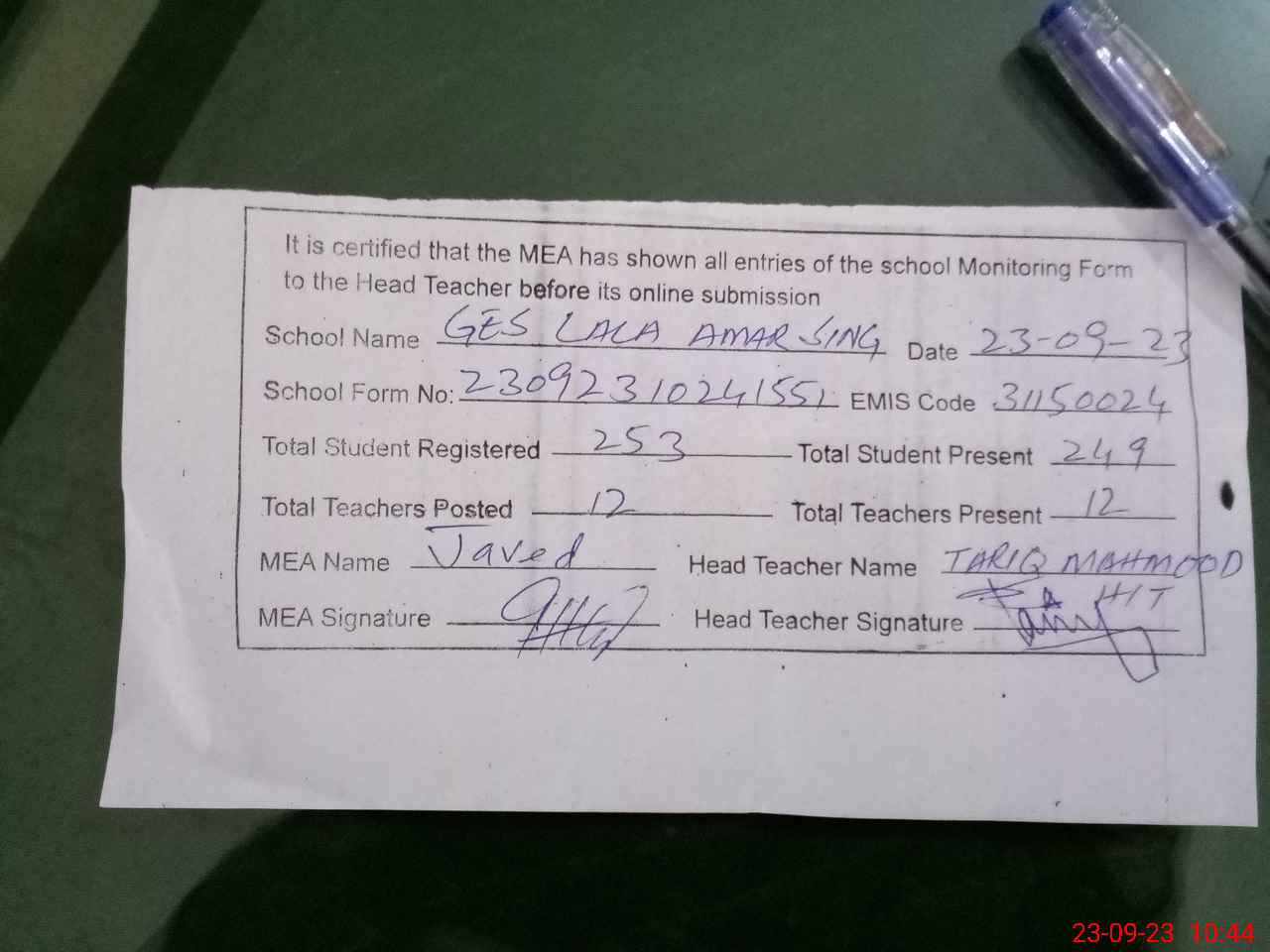 | Certified that this School was Inspected by the Undersigned MEA/DMO Today and the Information Stated Above is as Per Record. | |||||