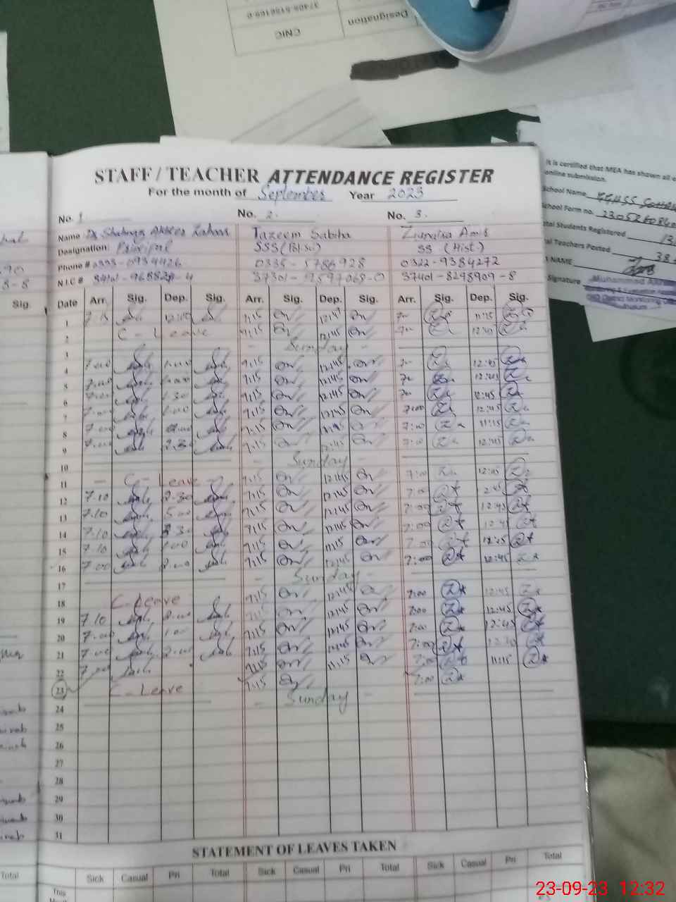 | Name: Gh**** An**** Designation: (School Headmaster's/Headmistress's) PRINCIPAL Phone/Cell Number: 03**** |