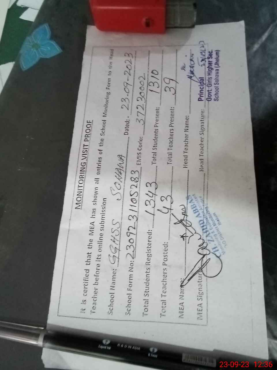 | Attendance Register | Head Teacher | MEA with School | Visit Proof |