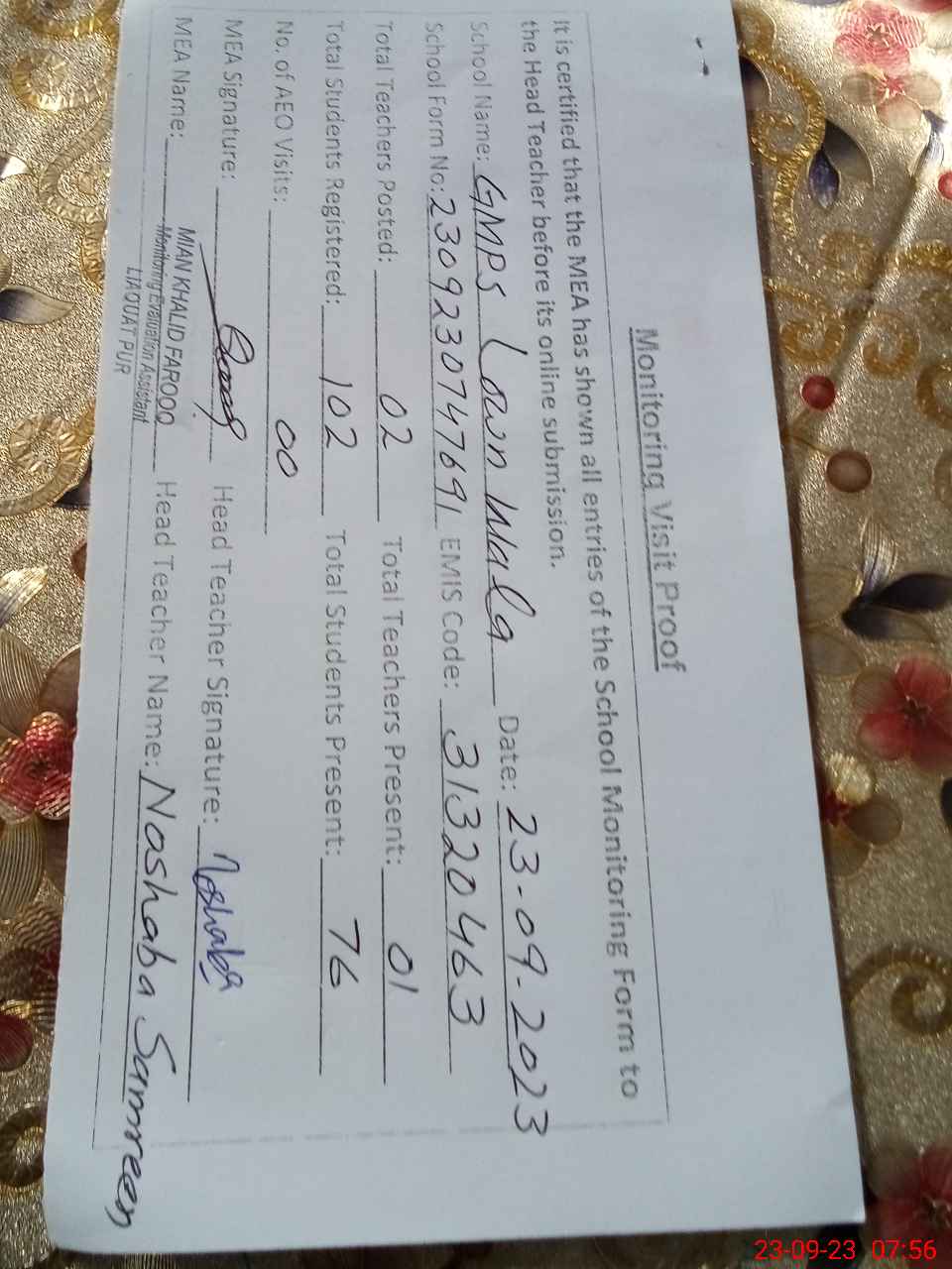 | Attendance Register | Head Teacher | MEA with School | Visit Proof |