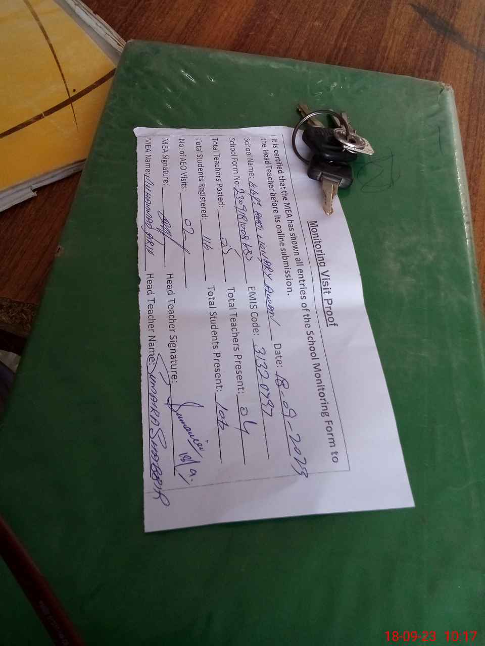 | Attendance Register | Head Teacher | MEA with School | Visit Proof |