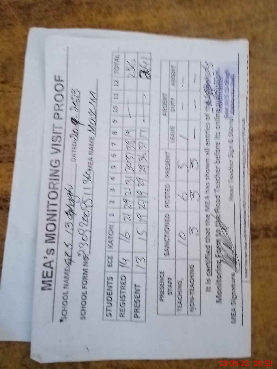 | Attendance Register | Head Teacher | MEA with School | Visit Proof |