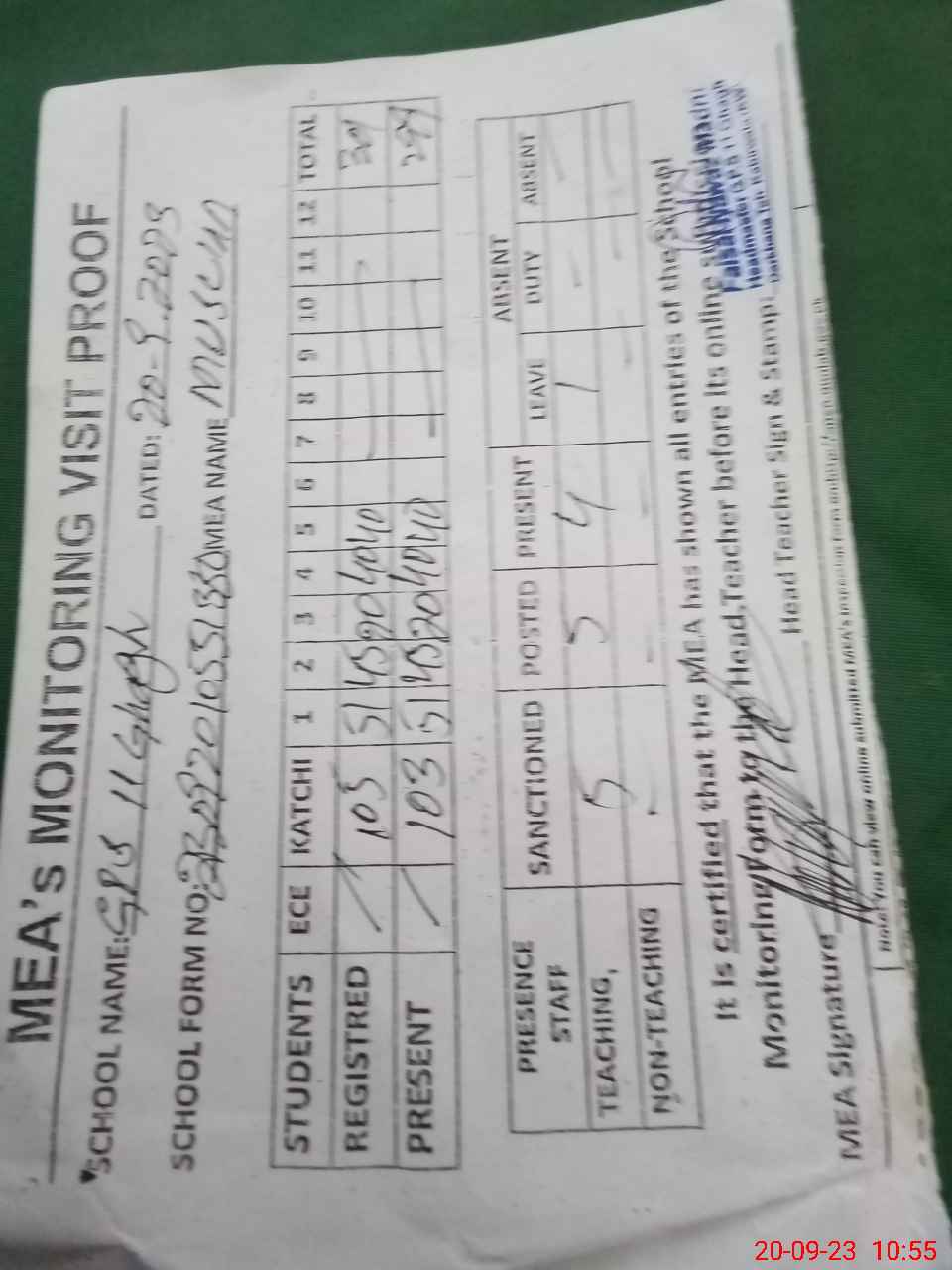 | Attendance Register | Head Teacher | MEA with School | Visit Proof |
