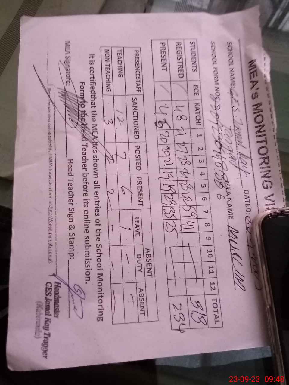 | Attendance Register | Head Teacher | MEA with School | Visit Proof |