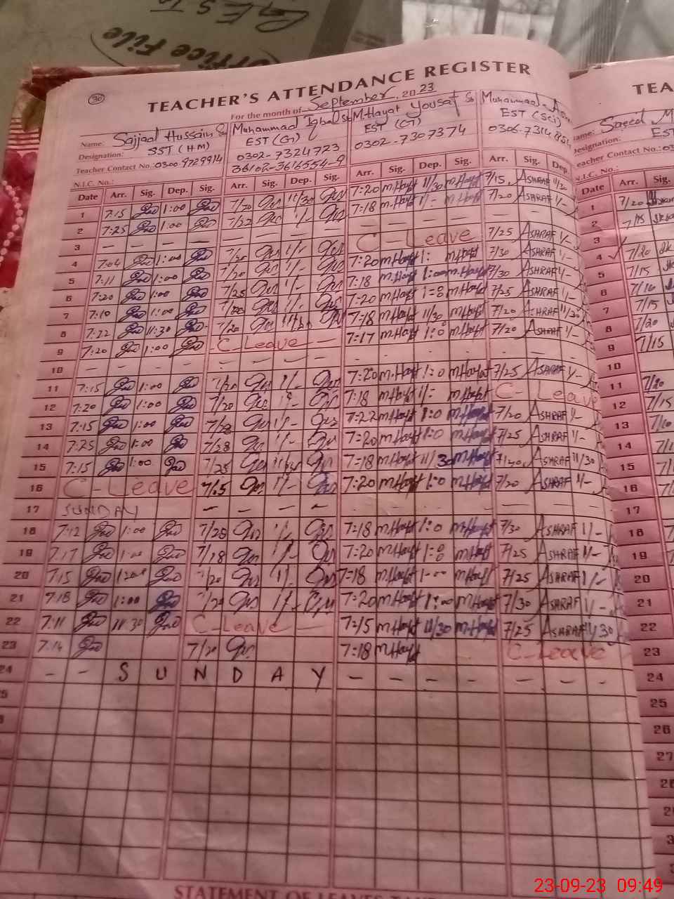 | Name: SA**** HU**** Designation: (School Headmaster's/Headmistress's) S.S.T Phone/Cell Number: 03**** |