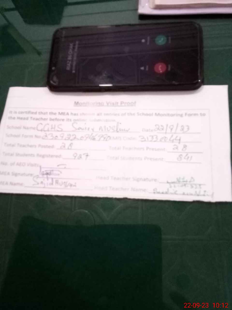 | Monitoring Date: 22-09-2023 | Start Time: 22-09-2023 09:31 AM | End Time: 22-09-2023 10:12 AM | Name of MEA: Sa**** Hu**** | |