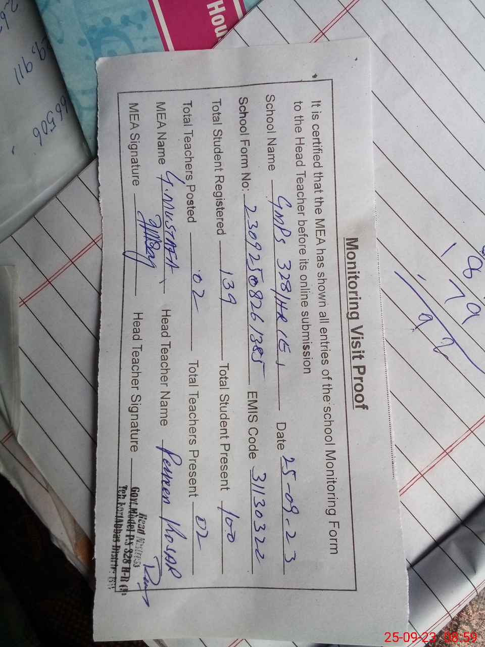 | Attendance Register | Head Teacher | MEA with School | Visit Proof |