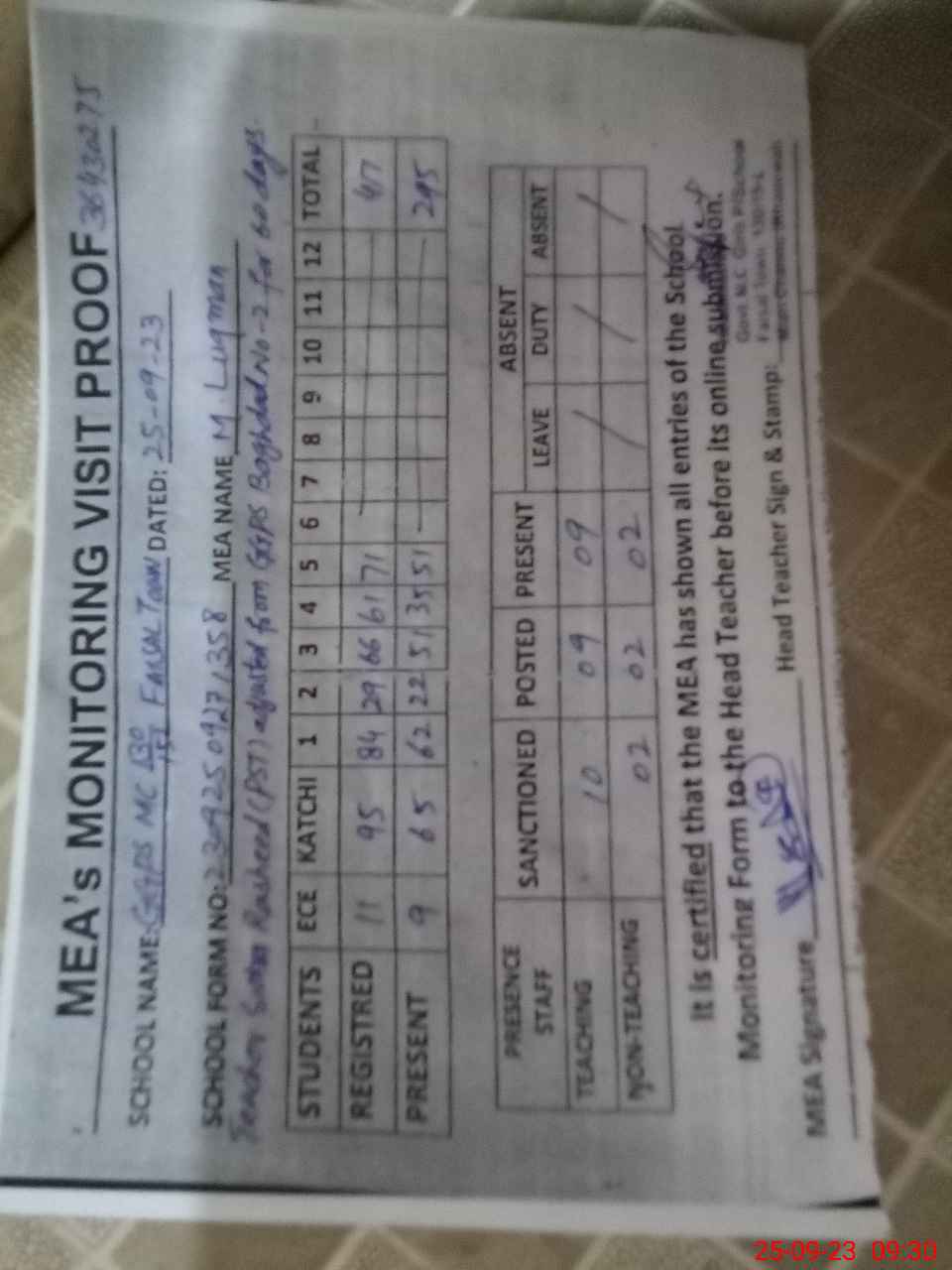 | Attendance Register | Head Teacher | MEA with School | Visit Proof |