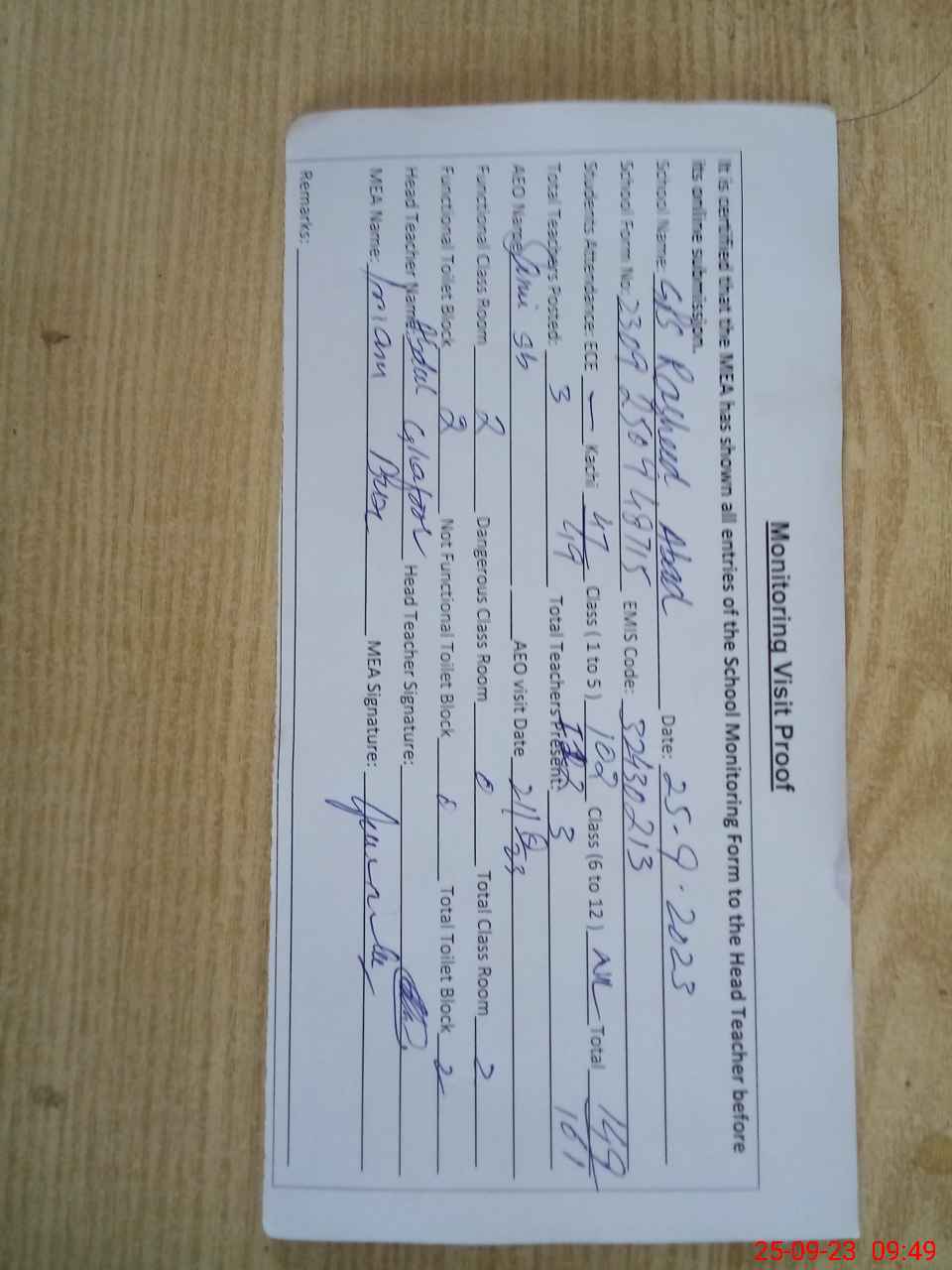 | Attendance Register | Head Teacher | MEA with School | Visit Proof |