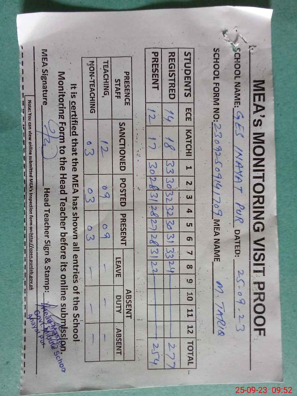 | Attendance Register | Head Teacher | MEA with School | Visit Proof |
