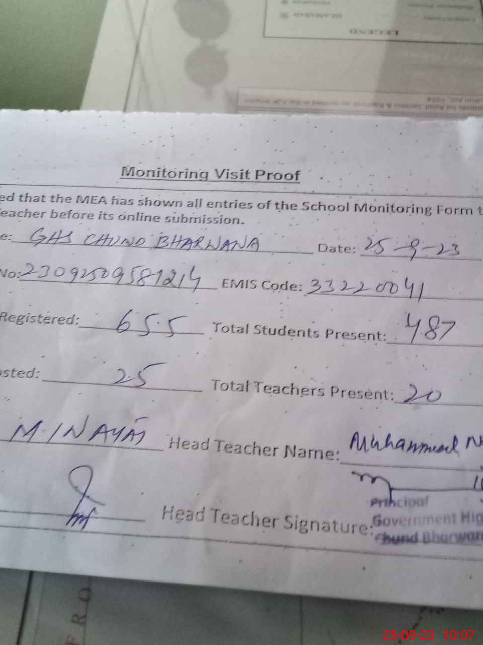 | Attendance Register | Head Teacher | MEA with School | Visit Proof |