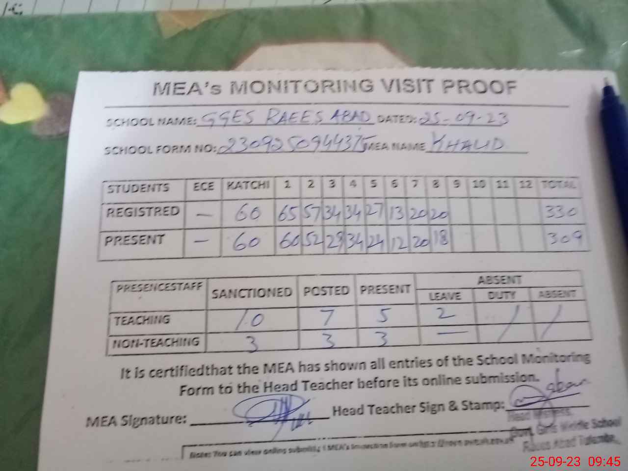 | Attendance Register | Head Teacher | MEA with School | Visit Proof |