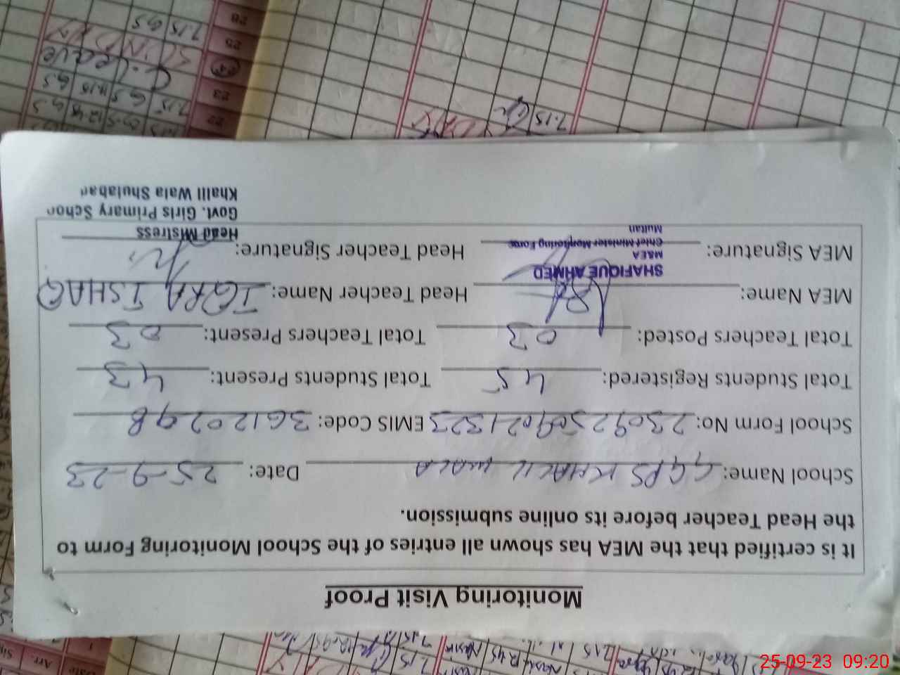 | Attendance Register | Head Teacher | MEA with School | Visit Proof |