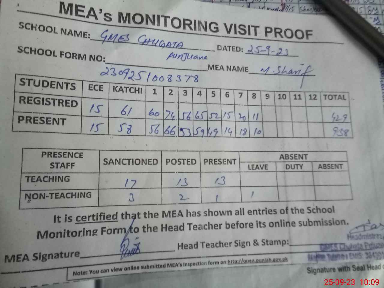| Attendance Register | Head Teacher | MEA with School | Visit Proof |