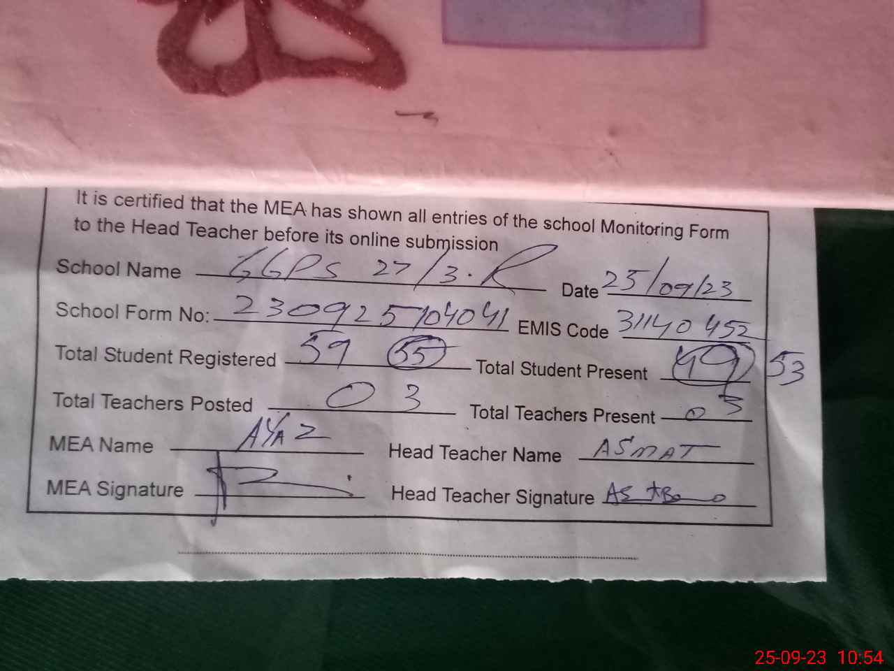 | Attendance Register | Head Teacher | MEA with School | Visit Proof |