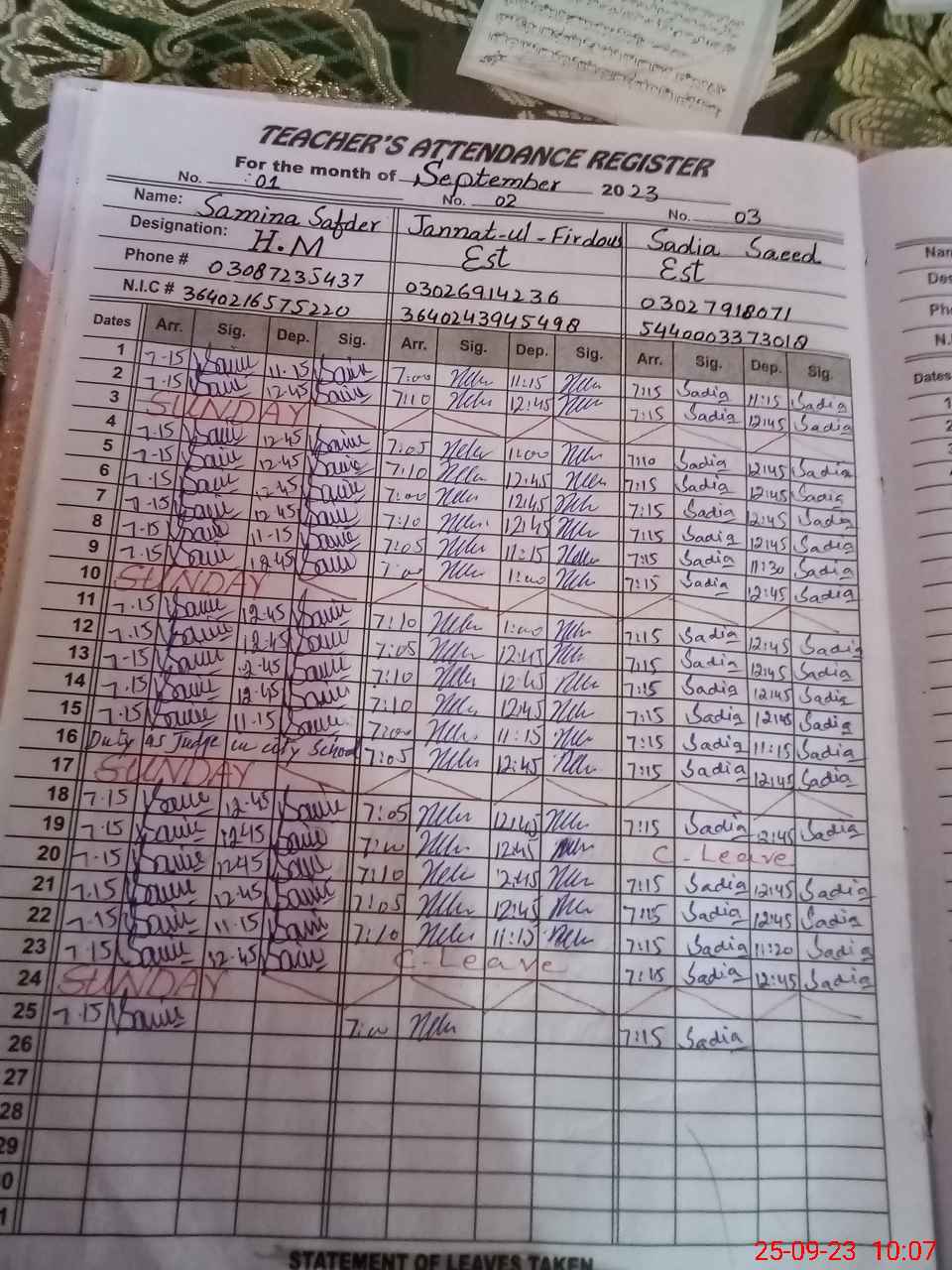 | CNIC | Full Name | Designation | R/C | Absence during last cal. month |