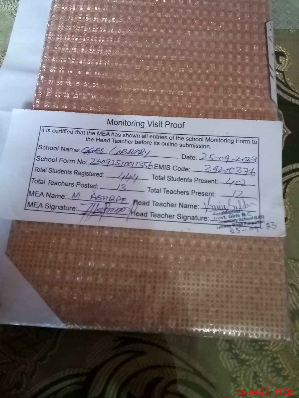 | Attendance Register | Head Teacher | MEA with School | Visit Proof |
