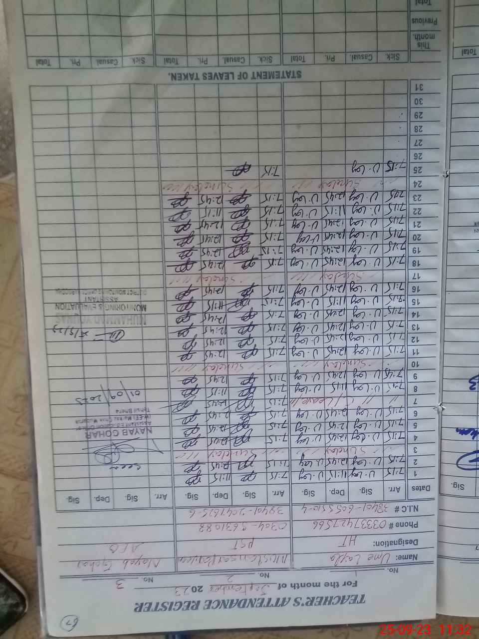 | Name: UM**** LA**** Designation: (School Headmaster's/Headmistress's) PST Phone/Cell Number: 03**** |
