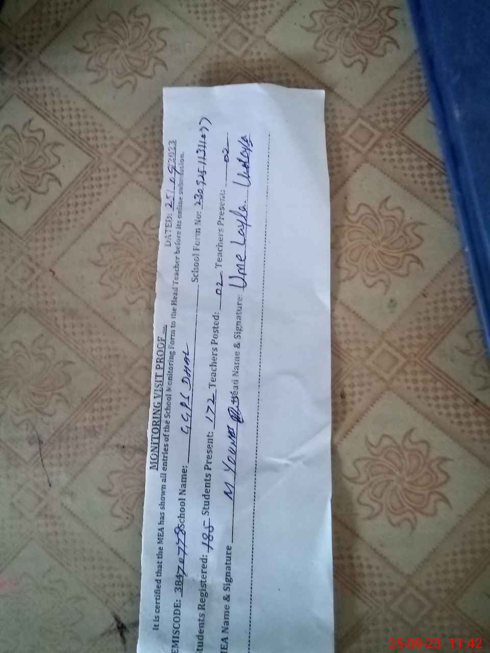 | Attendance Register | Head Teacher | MEA with School | Visit Proof |