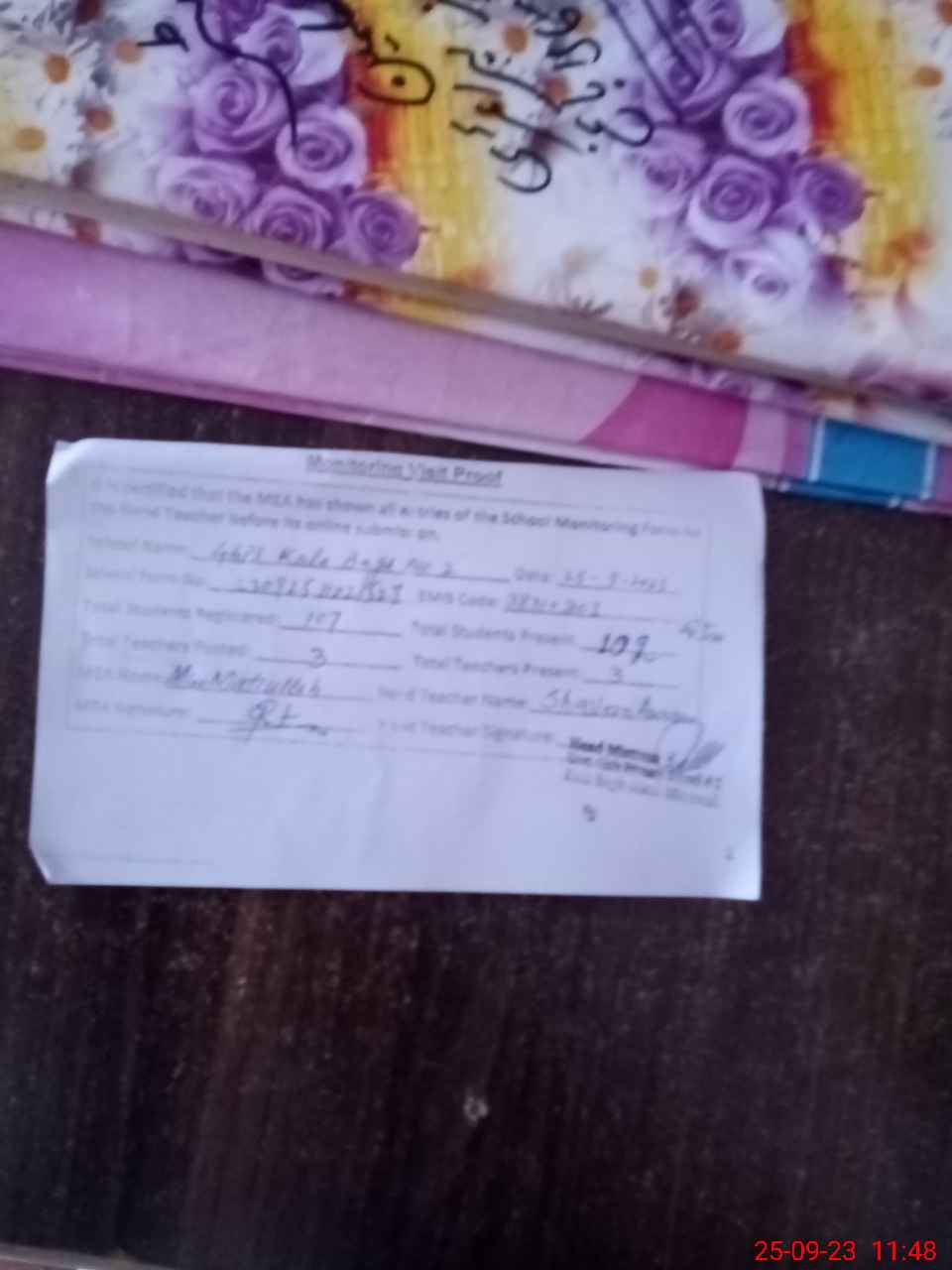| Attendance Register | Head Teacher | MEA with School | Visit Proof |