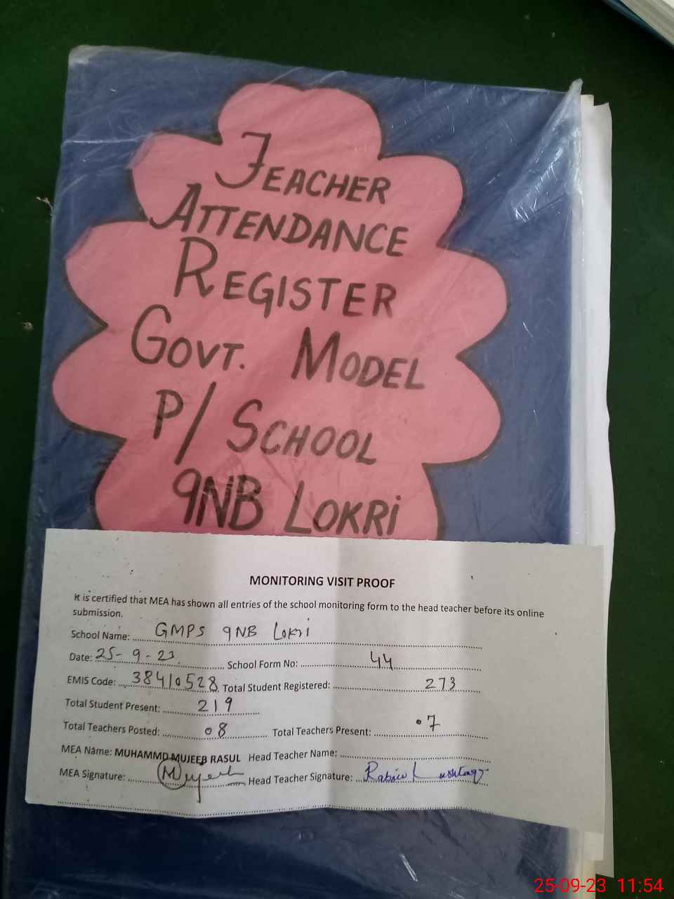 | Attendance Register | Head Teacher | MEA with School | Visit Proof |