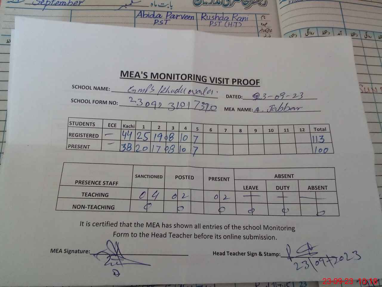 | Attendance Register | Head Teacher | MEA with School | Visit Proof |