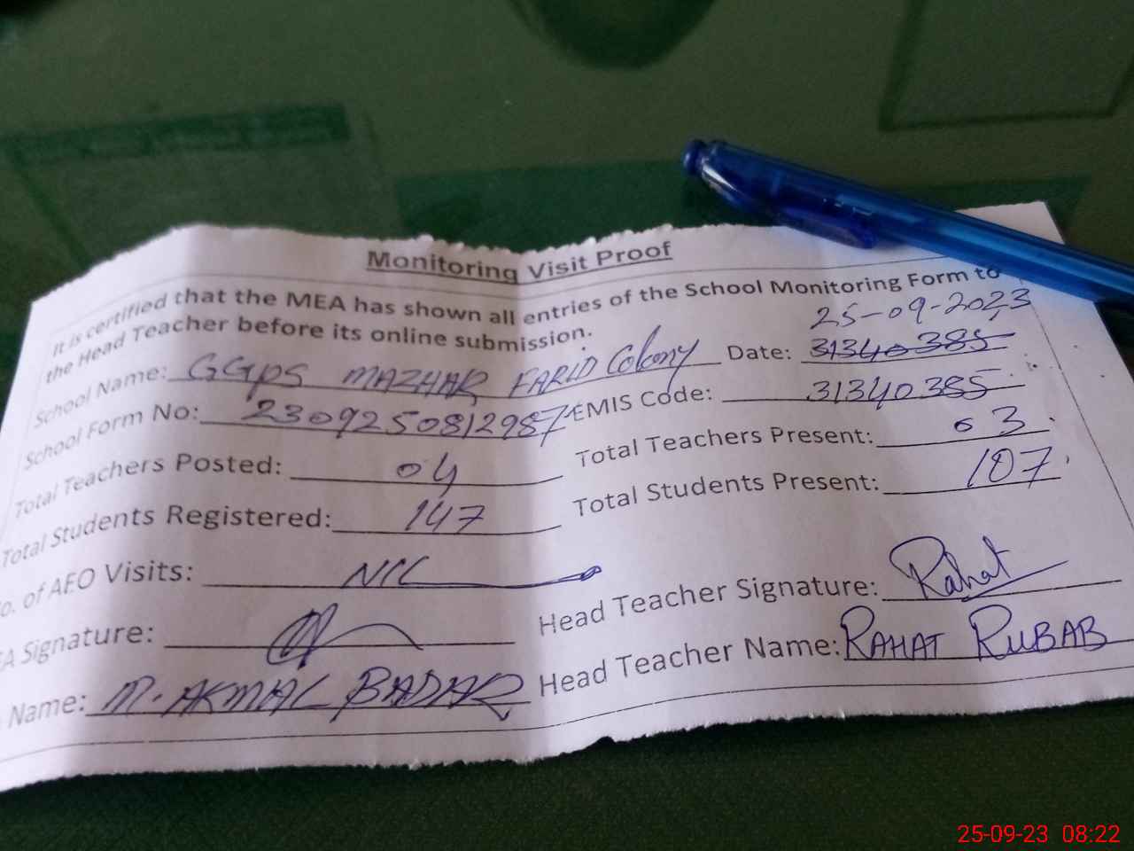 | Attendance Register | Head Teacher | MEA with School | Visit Proof |