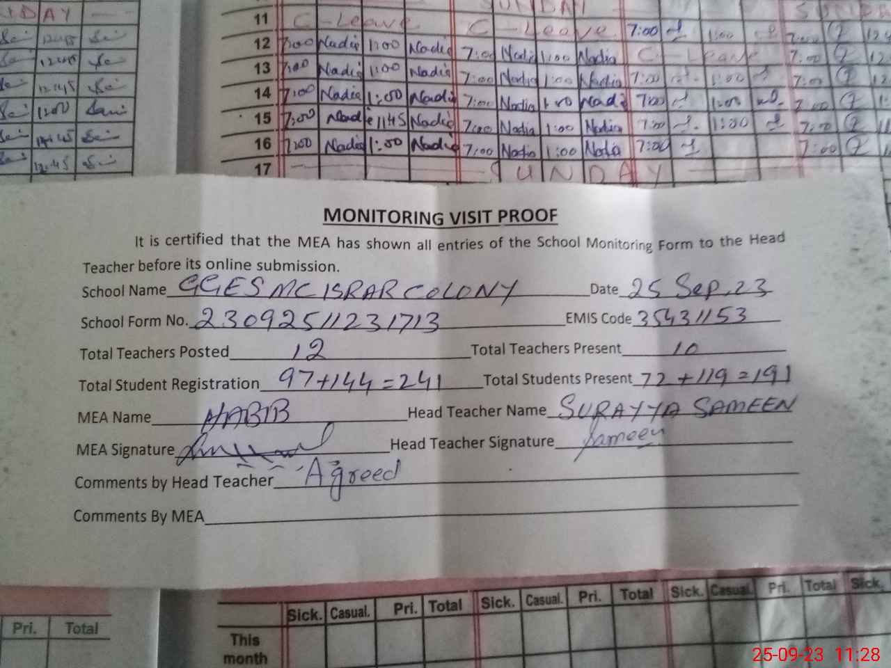 | Attendance Register | Head Teacher | MEA with School | Visit Proof |