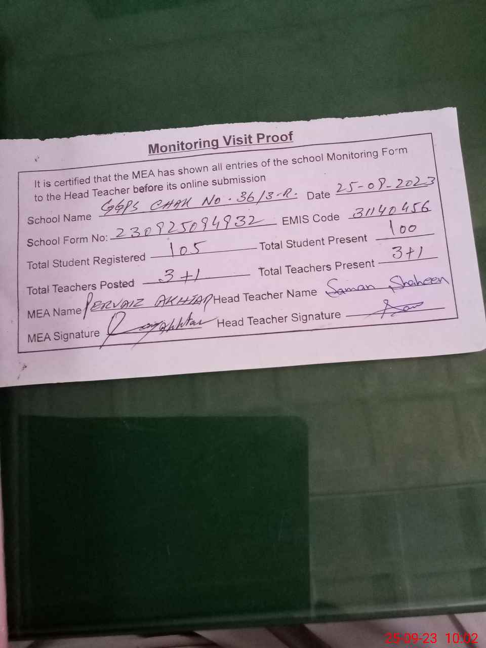 | Attendance Register | Head Teacher | MEA with School | Visit Proof |