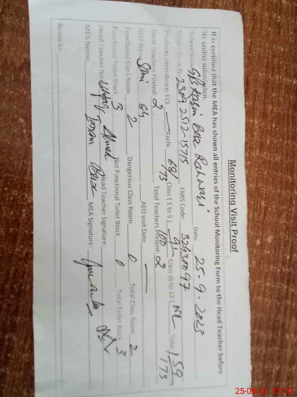 | Attendance Register | Head Teacher | MEA with School | Visit Proof |