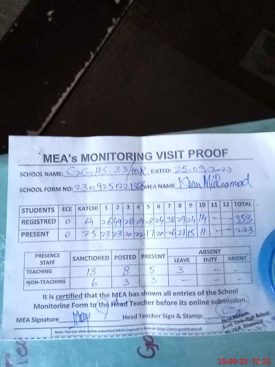 | Attendance Register | Head Teacher | MEA with School | Visit Proof |