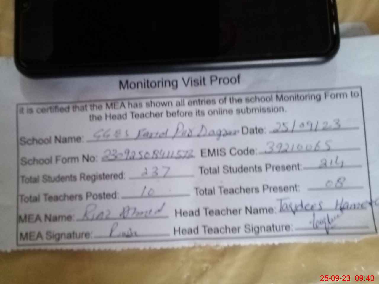 | Attendance Register | Head Teacher | MEA with School | Visit Proof |