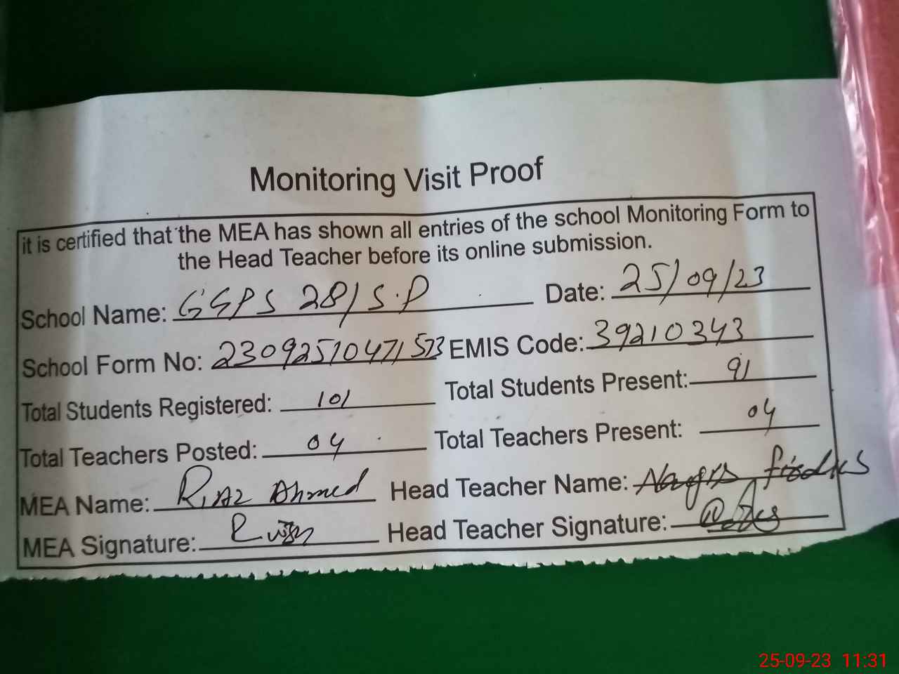 | Attendance Register | Head Teacher | MEA with School | Visit Proof |