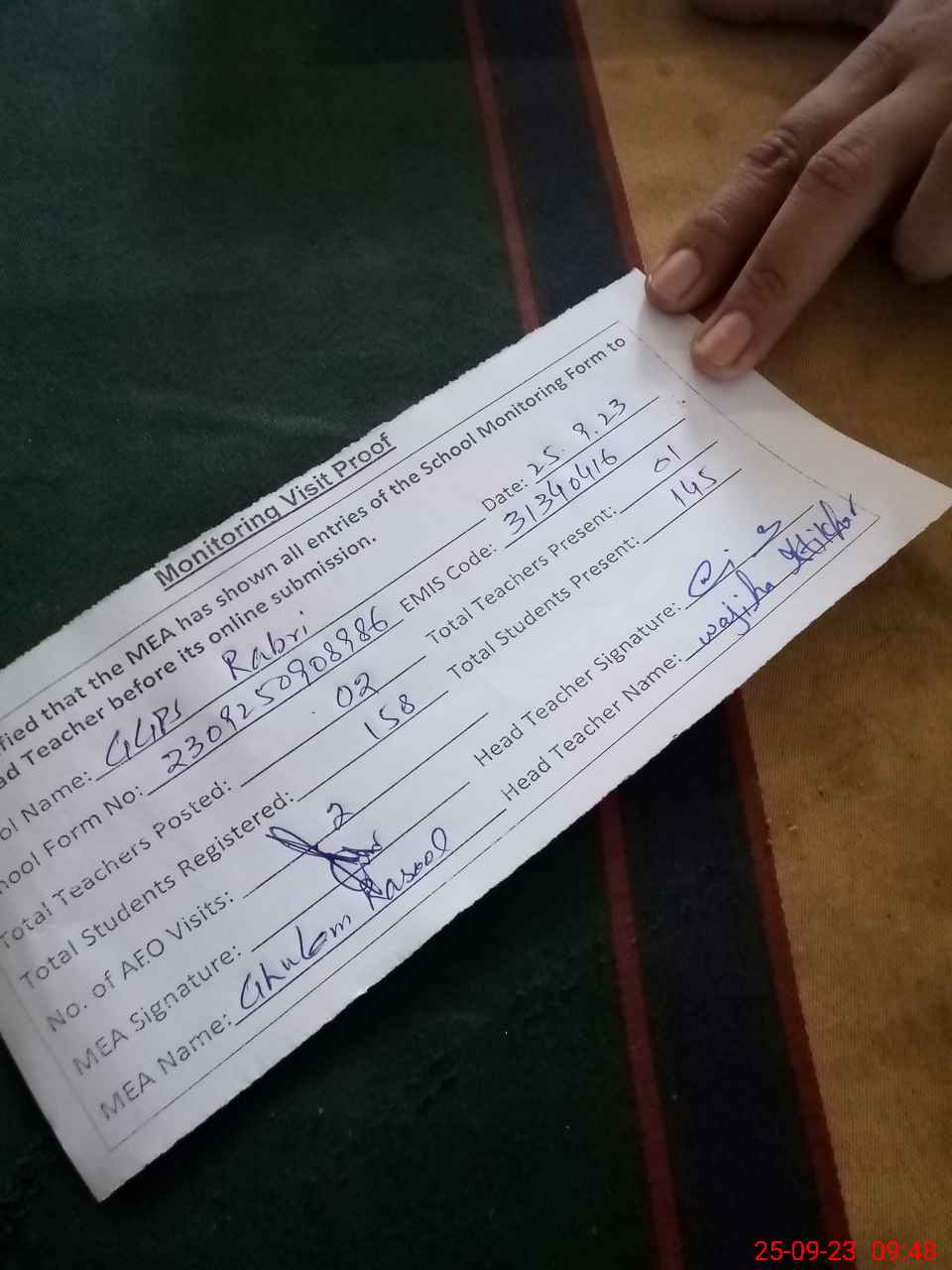 | Attendance Register | Head Teacher | MEA with School | Visit Proof |