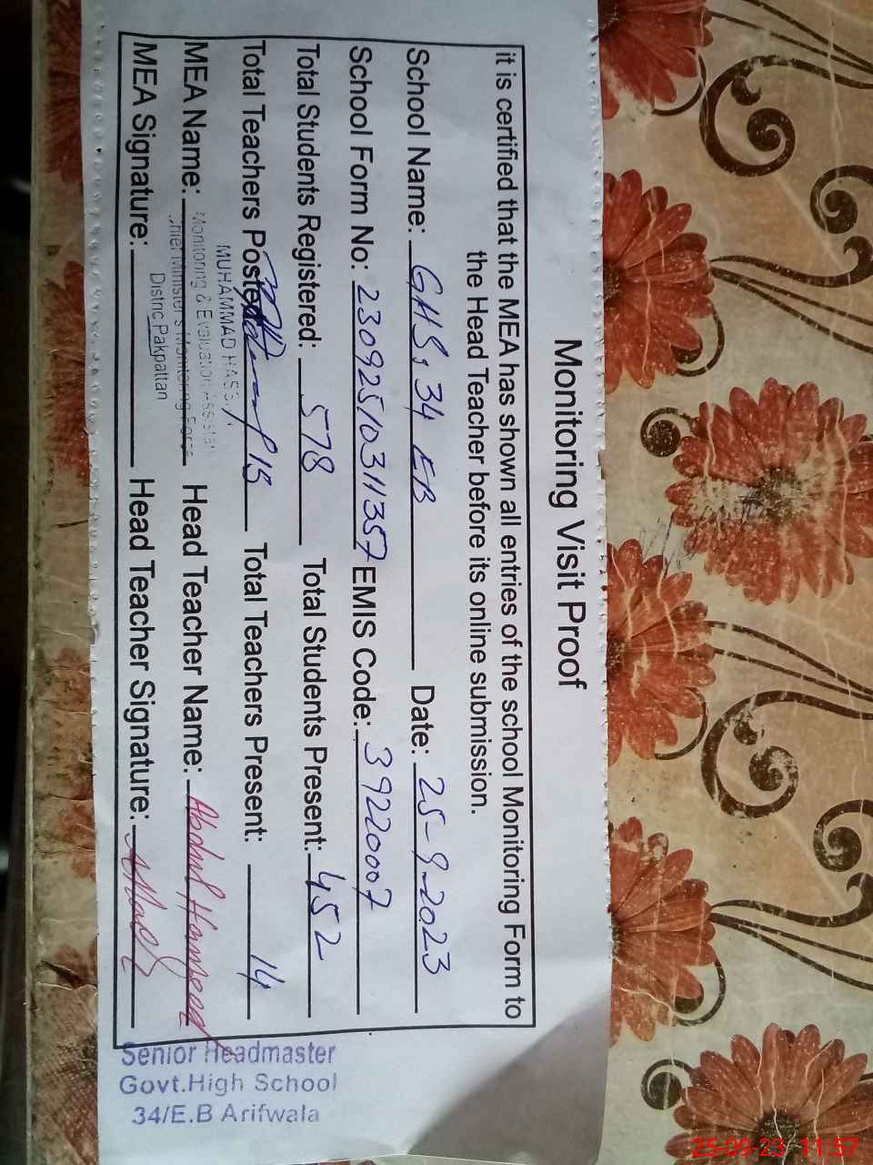 | EMIS Code: 39220007 | Name of School: GHS 34 EB ARIF WALA | |||