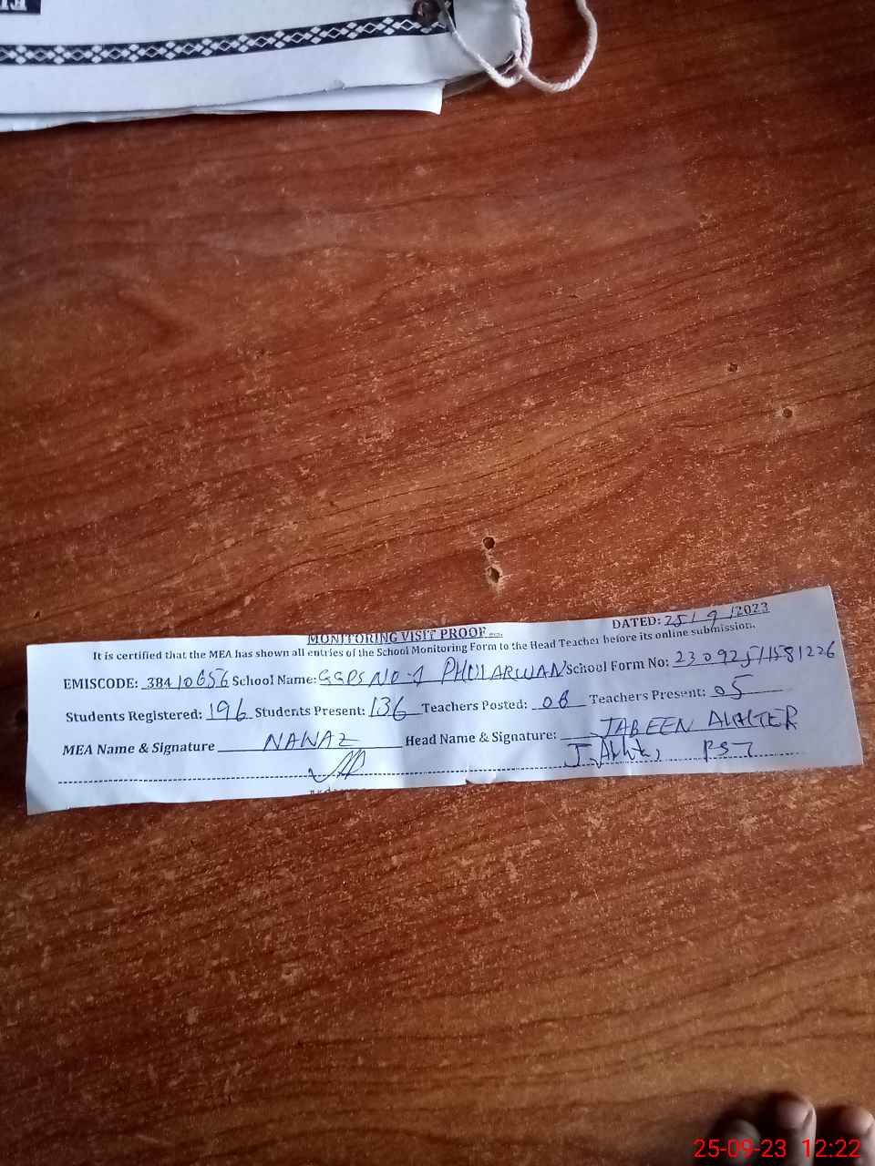 | Attendance Register | Head Teacher | MEA with School | Visit Proof |