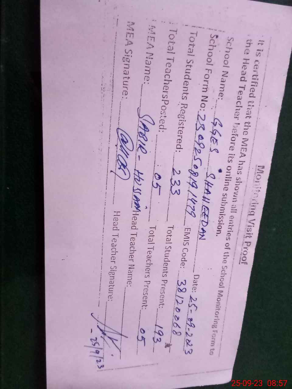 | Certified that this School was Inspected by the Undersigned MEA/DMO Today and the Information Stated Above is as Per Record. | |||||