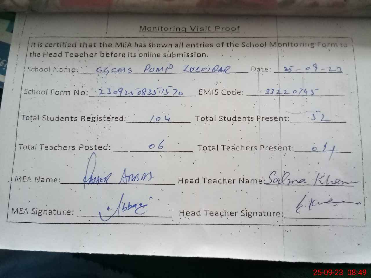 | EMIS Code: 33220745 | Name of School: GGCMS PUMP ZULFIQAR | |||